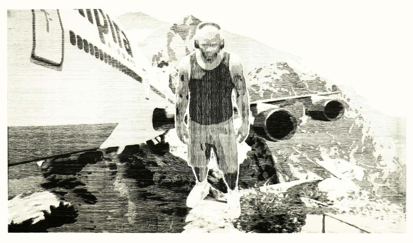 Toujours inventif dans les dispositifs de création qu’il emploie, Jean-Baptiste Perrot convertit physiquement l’imagerie numérique en matière (encre, crayon, peinture). Le papier est scarifié au scalpel en suivant le tracé d’une trame, sorte de code informatique produit par une machine, dont la réalisation est totalement rationalisée, selon un protocole strict. Le dessin ne peut échapper à cette trame, il la révèle à l’instant où le fusain met en exergue la scarification du papier. « Le dessin réalisé au fusain s’humanise,