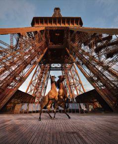Pour cette exposition, Paola Pivi a placé quatre chevaux sur la Tour Eiffel. Les chevaux semblent avoir trouvé un nouveau terrain de jeu, un paysage architecturé, à leur mesure. Là encore, Paola Pivi détourne et juxtapose habilement des éléments à la fois familiers et emblématiques et les métamorphose en une iconographie hallucinatoire.
