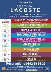 Festival de Lacoste Du 9 au 24 juillet 2015 Avec Emma Ré, La Commedia dell’Arte, Patrick Poivre d’Arvor, Eve Ruggieri, Véronique Sanson, Véronique Fourcaud, Cyrielle Clair, Gérard Chambre et Vanessa Wagner. Réservation : 0892 68 36 22 |