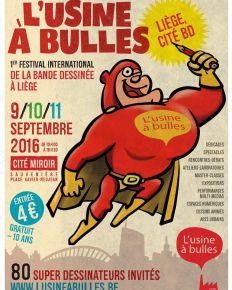 Du 9 au 11 septembre 2016 Les 9, 10 et 11 septembre 2016, la Cité Miroir accueillera “L’usine à bulles”, le premier festival international de la bande dessinée de Liège. Un festival original qui, outre les fameuses séances de dédicace, proposera également des ateliers-laboratoires de fabrication de BD, des espaces numériques, des masterclasses, des expositions, des performances multimédia ainsi que différents spectacles. Pensé et mis sur pied par des auteurs de BD, la joliment nommée “Usine à bulles” souhaite créer des passerelles entre le 9e Art et d’autres formes d’arts narratifs tels que le cinéma, le dessin animé, les arts urbains ou numériques.Plus de 80 auteurs ont répondu présent parmi lesquels de nombreux belges et liégeois : Batem, dessinateur de Marsupilami, Marc Hardy, père de Pierre Tombal, Laudec et son sympathique Cédric, Philippe Garbinet créateur de la série “Airbone 44”, et bien-sûr François Walthéry.