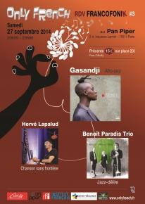Only French Avec Gasandji, Hervé Lapalud et Benoit Paradis Trio Le samedi 27 septembre 2014 Tarifs : De 15€ à 20€ Réservation en ligne Pan Piper |