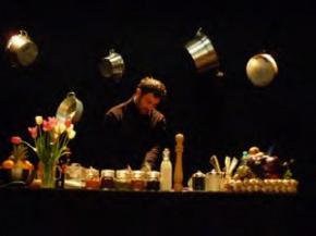 Le jeudi 26 juin 2014 Création réunissant musique, contes populaires, cuisine et vidéo, sousla forme d’un road-movie illustré par des images et de la musique live, la cuisine étant le liant «organique». Food Sound System retrace l’histoire de Don Pasta, cuistot poète, rêveur et écologiste qui ne cuisine jamais des plats hors saison. Il est contre la culture du fast-food, car quand il cuisine, il prend son temps. Il en profite pour raconter des histoires, pendant que courgettes, poivrons et aubergines fondent dans l’huile et diffusent leurs parfums qui éveillent les sens. Casseroles, pâtes, tomates sont parties intégrantes du spectacle. La lasagne étendue, qui sèche sur le fil, devient l’écran sur lequel les images sont projetées. Une magie s’opère entre le protagoniste et l’univers qui l’entoure. Food Sound System est un spectacle sur la cuisine comme lieu social, point de rencontre entre les gens et leur histoire. [Visuel : Don Pasta à l’oeuvre] |