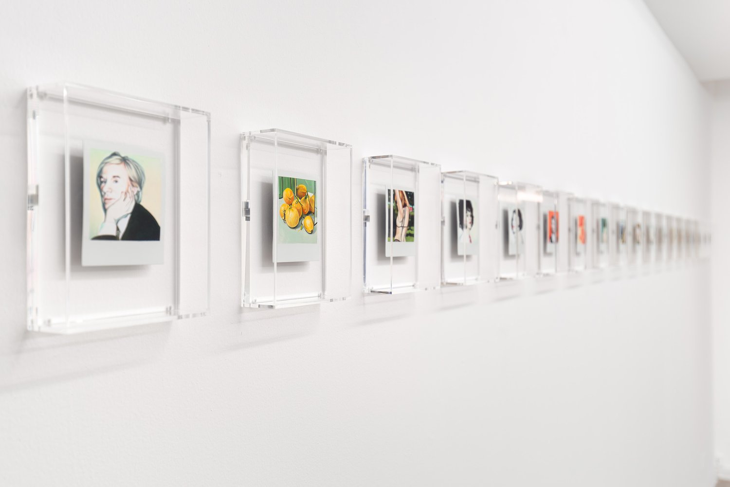 Le Polaroïd représente pour Bizot le premier appareil à selfie. Les expositions précédentes de l’artiste ont démontré son intérêt pour les réseaux sociaux, dans le sens littéral de ce phénomène. Aujourd’hui, elle s’adresse au côté pratique et technique du support virtuel. Avant Kim Kardashian, c’est Andy Warhol qui a défini l’idée de selfie lors de séances inoubliables et toujours avec l’aide d’un Polaroïd. Il faut d’ailleurs rappeler qu’il a été un graphiste réputé de la publicité durant de longues années. Pris sur le vif, les Polaroïds de Warhol définissaient son époque comme Instagram dévoile la nôtre. France Bizot s’attache ainsi à décrire et peindre notre présent perpétuel et les timelines permanentes qui défilent sur nos téléphones, à travers une série de peintures aux différents supports (dont de véritables Polaroïds vintage qui s’effacent pour laisser la place au pinceau de l’artiste). Le format du Polaroïd n’est d’ailleurs pas sans rappeler celui de l’Iphone. Et puisqu’aujourd’hui nous découvrons essentiellement les œuvres d’art d’abord par le biais du téléphone portable, France Bizot a donc réalisé des œuvres de cette taille-là, ou dans ce même rapport de format mais en plus monumental.