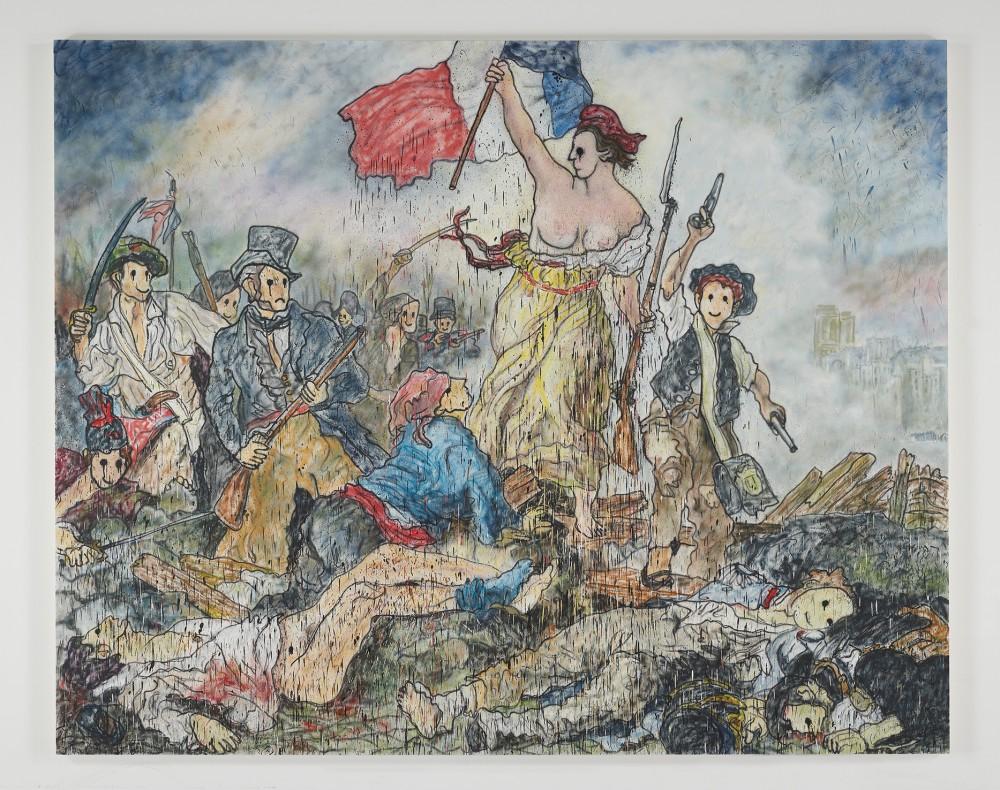 « Cette exposition personnelle à Paris est très importante pour moi. Monsieur Perrotin aime les pièces de ma série Wannabe et m’a suggéré de revisiter la peinture française classique à travers cette nouvelle série. Je me suis mis au travail et visité divers musées français pour sélectionner des œuvres de grands maîtres, parmi lesquels Gauguin, Monet, Manet, Delacroix, Ingres, entre autres. Généralement, je travaille plutôt vite, mais ce n’est pas toujours le cas. Bonaparte franchissant le Grand Saint-Bernard, de Jacques-Louis David, m’a pris un temps fou, par exemple ! Je ne peux pas faire comme si ça avait été facile ! J’ai vraiment dû aller puiser dans chacune des compositions et appliquer beaucoup de couches de couleurs. J’utilise les embouts de diverses bombes pour obtenir différents effets et je crée mes propres capuchons personnalisés. Lorsque la toile est relativement petite, il m’arrive d’utiliser mes deux mains. Pour Les Joueurs de cartes de Cézanne, j’ai utilisé deux bombes de peinture en même temps. »