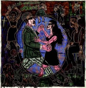 Cette exposition présente un ensemble très important d’oeuvres abordant sous toutes les formes la question de « Geneviève », la compagne de Robert Combas qui est également sa muse. Robert Combas est un peintre qui explore les passions humaines, sa peinture est un théâtre des émotions. Angers était le lieu tout trouvé La rencontre de Robert, le peintre, et Geneviève, la danseuse, a eu lieu à Paris dans la nuit du 27 au 28 juin 1987. Et quelques mois plus tard, Geneviève s’installe en résidence au Centre National L’essentiel des oeuvres présentées appartiennent à l’artiste, à Geneviève et à Laurent Strouk, le marchand d’art de Robert Combas.