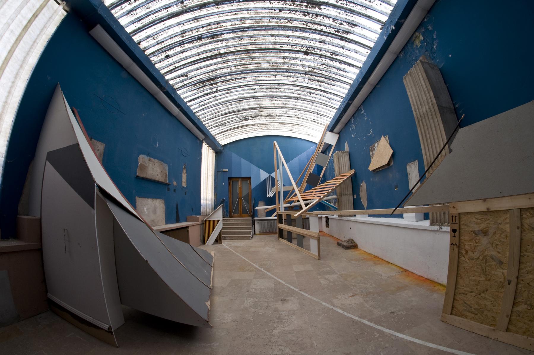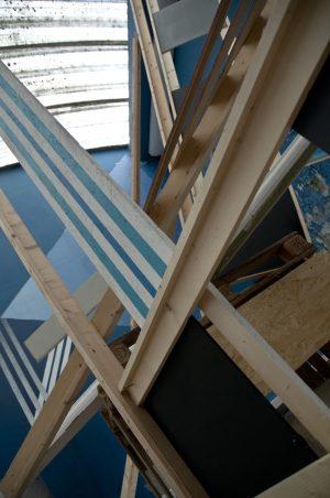 A partir des matériaux retrouvés sur place il a pris possession de l’espace pour créer une installation dynamique et géométrique tout en prenant soin de préserver l’âme et les stigmates de l’environnement présent.