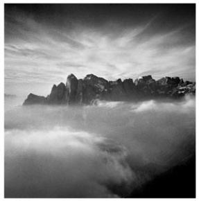 Ces photographies en noir et blanc, tirées en très grand format, nous promènent à travers des paysages de nuages, au point précis où la terre rejoint le ciel.