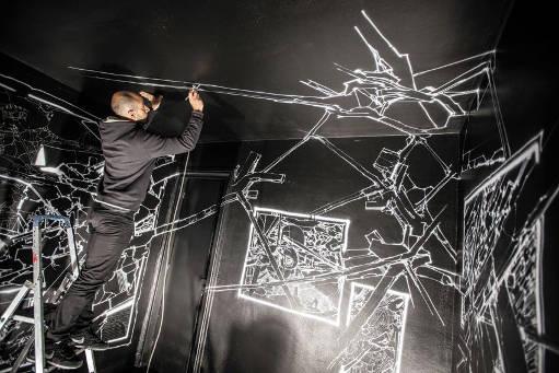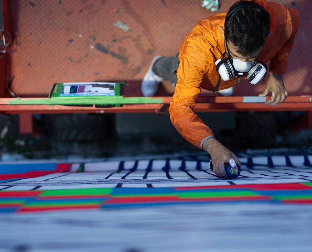 LEK fait le lien entre le dessin industriel, l’architecture et le graffiti. Sa pratique dans la rue s’éloigne peu à peu du lettrage pour embrasser une abstraction structurée aux lignes, patterns et formes géométriques qui s’interpénètrent. Lek a étendu son travail débuté dans la rue aux friches industriels et lieux abandonnés pour parfaire ses techniques, évoluer et multiplier les oeuvres collectives à plusieurs. C’est dans ce prolongement que né le Mausolée. Aujourd’hui, son travail investit autant la peinture que le cut-up avec différents matériaux comme le scotch. Son approche redéfinit la notion même de patterns et de motifs. Lauréat de la Villa Médicis, Lek oscille entre projets conceptuels sauvages comme le Mausolée, les projets institutionnels pour les monuments nationaux ou le ministère de la Culture, l’univers de la mode et un travail en atelier polymorphe.