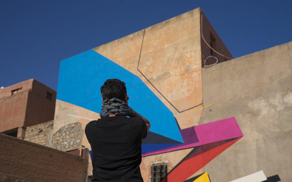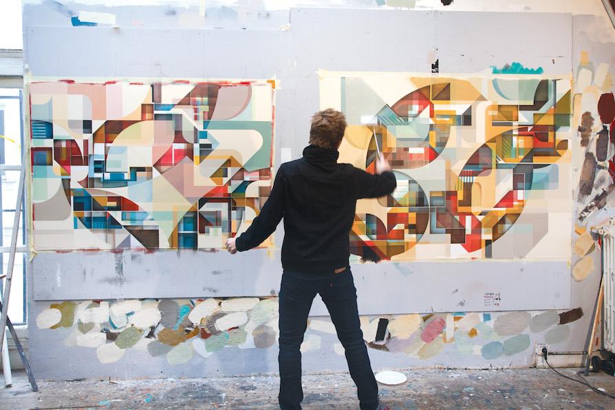 Swiz découvre le graffiti au début des années 2000 comme un formidable moyen de multiplier les formes et les couleurs qu’il compose dans ses lettres. Sa pratique du graffiti a été intimement liée à la découverte de friches et d’espaces abandonnées. Inspiré par l’architecture et le cubisme, les lettres sont encore là mais elles se révèlent plus qu’elles ne s’imposent. En 2008, il se tourne peu à peu vers une production en atelier. Son travail s’est en studio émancipée vers un travail de compositions géométriques et architecturales qui rappelle le Bauhaus. Sa transition en atelier s’est aussi tournée vers une économie de moyens en couleurs et en peinture où les formes et la géométries deviennent une nouvelle forme de langage.