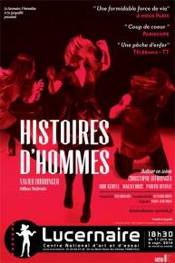 Histoires d’hommes De Xavier Durringer Mise en scène de Christophe Luthringer Avec Magali Bros, Pauline Devinat et Aude Kerivel Musique de Elsa Quignard Jusqu’au 6 septembre 2014 Réservation en ligne ou par tél. au 01 45 44 57 34 (Du lundi au vendredi : 10h30-12h30 / 13h30-22h Durée : 1h Le Lucernaire |