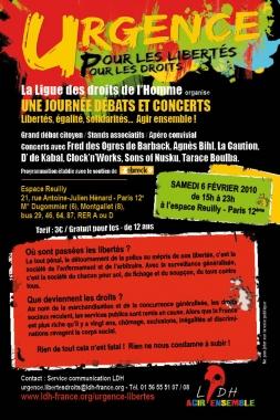 Dans le cadre de sa campagne « Urgence pour les libertés ! Urgence pour les droits ! », la Ligue des droits de l’Homme organise une journée débats-concerts le samedi 6 février 2010 dès 15h00 à l’espace Reuilly, dans le 12ème arrondissement de Paris.