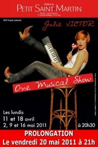 Jeune fille rousse, bien élevée, auréolée d’une joyeuse folie. Julie a de multiples facettes… Fille de Marianne James dans Les aventures de Rabbi Jacob au Palais des Congrès de Paris, elle est aussi Sally Bowles dans Cabaret aux Folies Bergères, et joue dans Fame. Elle crée Mission Florimont au Théâtre Tristan Bernard, pièce nominée aux Molières 2010 ! Et aujourd’hui, elle nous embarque dans son one musical show : une heure énergisante de sketchs et de chansons déjantées…