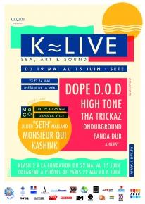 K-Live est un concept original, pluridisciplinaire, un festival qui crée un pont entre arts urbains, arts plastiques et concerts de musiques actuelles. Depuis 2008, K-Live investit, chaque année un peu plus, la ville de Sète. Centré sur le Théâtre de la Mer, le festival s’étend dans d’autres espaces culturels, touristiques et urbains.