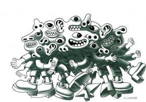 Derrière l’aspect satirique d’une partie de ses dessins aux traits acerbes et à l’humour noir, il développe une veine plus mystérieuse, dans la lignée de Topor, un univers onirique proche du surréalisme. Enrichi de ces multiples expériences artistiques, le dessin de Killoffer occupe une position originale dans les recherches plastiques contemporaines.