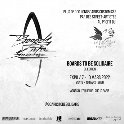 La 3e édition de Boards To Be Solidaire aura lieu du 7 au 10 mars au siège d’agnès b. (17 rue Dieu, 75010 Paris) avec le soutien d’Artcurial, Arnaud Oliveux, Boardz.eu, Le Géant des Beaux-Arts, Urban Arts magazine, Invaluable.
