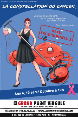 Désespoir, envie de lutter, situations ubuesques à la banque, aux pompes funèbres, bagarres avec des répondeurs téléphoniques, avis divers et variés de chacun qui y va de son petit conseil : « mange bio », « fais des prières »… Elle navigue entre les standardistes à la ramasse, les brochures flippantes et ose fantasmer sur des « Apollon », compagnons de route de chimio.