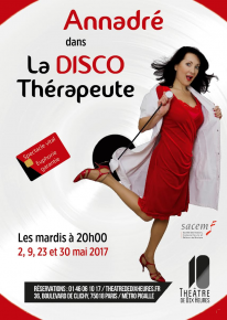 La Discothérapeute au Théâtre de Dix Heures De Annadré Mise en scène de Nicolas Vallée Avec Annadré Du 2 mai au 30 mai 2017, à 20h Tarifs : 18€ Réservation en ligne ou par tél. au 01 46 06 10 17 Durée : 1h30 Théâtre de Dix Heures |
