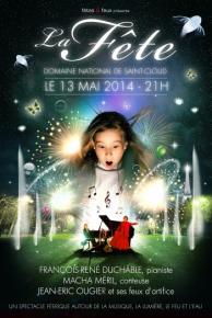 La Fête c’est un spectacle multi-artistique qui enfin rend aux vraies festivités leurs lettres de noblesse. Dans les sublimes jardins du parc de Saint-Cloud, qui accueillaient autrefois les plus belles fêtes de France, ce sont tous les plaisirs et toute la féerie d’antan qui renaissent. Sous les mains virtuoses de François-René Duchâble, Macha Méril interprétera une véritable ode à la joie sous un ciel illuminé de milliers d’étoiles scintillantes et crépitantes. Des feux d’artifices merveilleux mais aussi un fantastique ballet de jets d’eau, de lumières et la présence féérique de cerfs-volants.