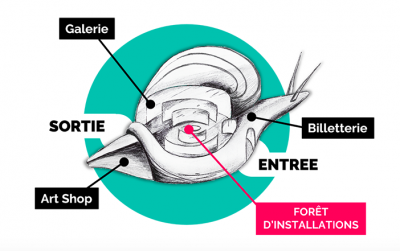 A l’extérieur, orné d’une couronne dorée, la queue habillée par EvazéSir et la coquille  peinte de Michael Beerens. Par sa tête illuminée de phares de voitures, le visiteur entre et découvre une vaste forêt, et déambule devant un totem gigantesque de Nosbé aux allures animales, vers la douceur d’une suspension d’origamis lumineuse de  Mademoiselle Maurice, au rêve dame natureimaginée par Vinie.Au détour d’un arbre d’Anis, le visiteur pourra se reposer dans les bras des pandas de Doudou’Style, animer les girafes de Mosko, traverser la souche sphérique de Wayne pour découvrir les araignées géantes de Swar.A l’image de la spirale de l’escargot, de manière continue et infinie, le spectateur est immergé dans la forêt, passant d’un univers à l’autre.