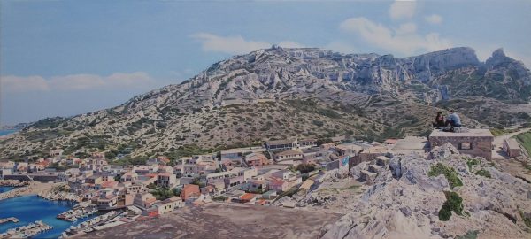 Autre ode à la nature, la peinture hyperréaliste d’Adrien Belgrand représente un couple surplombant la plage de la baie des singes à Marseille. Seuls dans un monde aux couleurs hétéroclites où la mer côtoie les graffitis, ils semblent se dire que tout est possible. A ce paysage où les personnages se noient dans le décor, succède une série de portraits de Rebecca Brodskis. Changement d’échelle ou plutôt de point de vue, les personnages en gros plan nous livrent tout ce qui les habite. En écoutant le silence dépeint une femme en position d’observation. Ce qui l’entoure semble déteindre sur sa peau comme si les reflets du jour naissant se muaient en lumière intérieure.