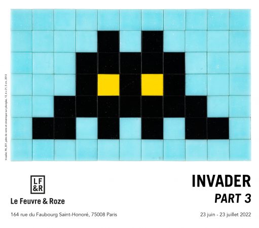 Cinq ans après “Invader : Masterpieces”, la galerie a le plaisir de présenter “Invader : Part III”, une exposition dévoilant une série d’œuvres symboliques, représentatives du travail de l’artiste : Rubik’s cubes, Alias, pièces uniques, Guides d’invasion avec micro-céramique, Kits d’invasion…
