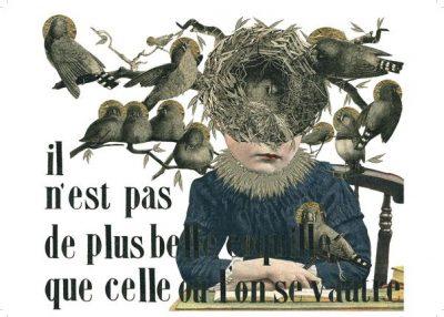 À partir de vieilles photographies du siècle dernier, Madame Moustache créée de nouvelles images, plus contemporaines. Ces visuels originaux ont pour particularité d’être toujours articulés de la manière suivante : une image et une phrase courte qui dialoguent sans pour autant s’illustrer l’un l’autre. Une fois ces collages en petits formats finalisés, ils sont scannés pour être imprimés en très grand format et apposés dans la rue, afin d’offrir aux passants une porte ouverte vers un imaginaire décalé et ludique.