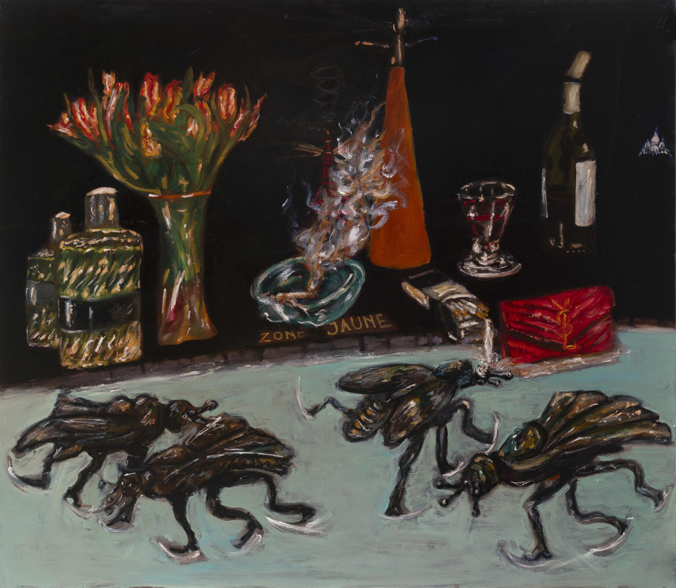 Comme toujours chez Van Imschoot, la peinture devient un terrain de jeux propice à une réflexion sur la relation triangulaire entre trois de ses plus grandes passions : l’art, le langage et la vérité. Les bateaux-mouches de la ville lumières sont représentés en insectes éponymes dans Le Pari de Paris ; alors que quelques “Trahisons des Images” de Magritte réinvestissent la surface des Fameux Paresseux Heureux.