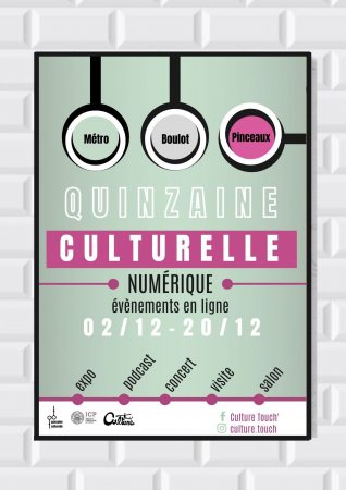 Du 3 au 20 décembre, les étudiants du DU d’ingénierie culturelle de l’Institut Catholique de Paris organisent comme chaque année une Quinzaine culturelle. Cette année, ils ont choisi comme thème général “Métro, Boulot, Pinceaux”, comme symbole d’inclusion de l’Art dans notre quotidien réduit actuellement aux activités essentielles.