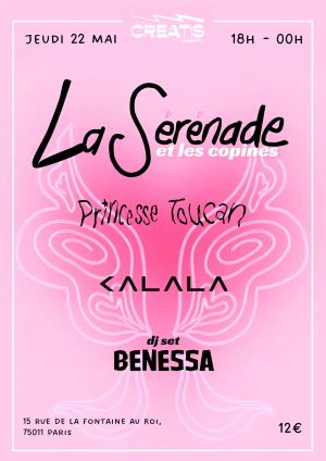 La Sérénade s’associe à Creatis pour une soirée 100% féminine à l’occasion de la release de son tout premier EP « Brouhaha ».Venez vous plonger dans une ambiance girlie et glitters le temps d’une soirée et laissez vous emporter dans l’univers de 4 artistes indépendantes plus prometteuse les unes que les autres.