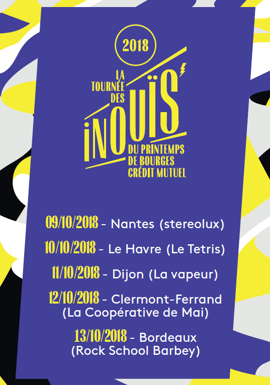 Depuis 2012, Le Printemps de Bourges Crédit Mutuel récompense à l’issue du festival les iNOUïS par deux prix – Le Prix du Printemps de Bourges Crédit Mutuel – iNOUïS et le Prix du Jury – iNOUïS.