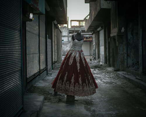 Une robe de bal dans une ruelle de Raqqa. Après une décenie de guerre, la ville est particulièrement détruite mais la vie reprends, petit à petit, pour les habitants meurtris mais résilients © Chloe Sharrock