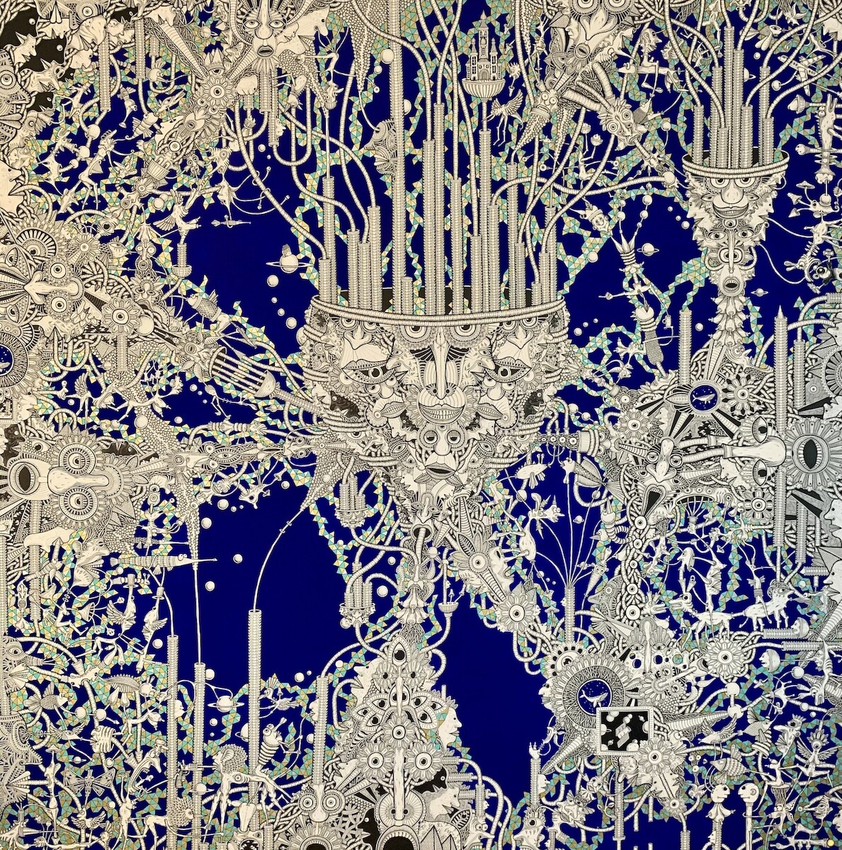 Sont aussi dévoilées les nouvelles œuvres de Léonard Combier (By Lara Sedbon). L’artiste français présente une peinture monumentale déclinant la densité de son univers se détachant d’un bleu profond. Des œuvres sur toile et plexiglas devinant son bestiaire fantastique au croisement de l’homme et de l’animal complètent sa vision de l’hybridation.