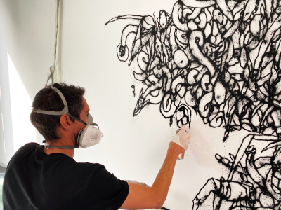 Outre le graffiti, qu’il pratique depuis 1998, il y expérimente l’art vidéo, le graphisme, l’illustration, disciplines qu’il exercera ensuite de nombreuses années. Muraliste protéiforme, il affirme désormais son style où la figure se substitue à la graphie. Son univers onirique au surréalisme post-moderne l’installe très vite parmi les street-artistes les plus originaux. Des murs de Paris, ses créatures gagnent ceux d’autres villes et continents, au fil de voyages riches en rencontres et chocs esthétiques. Ces territoires qu’il a sillonnés produisent des labours fructueux, dans une mixité de techniques en accumulations et samples, villes, banlieues, bidonvilles et campagnes se collisionnent aux couleurs d’un hip-hop mâtiné de métal, à la fois fluide et grinçant.