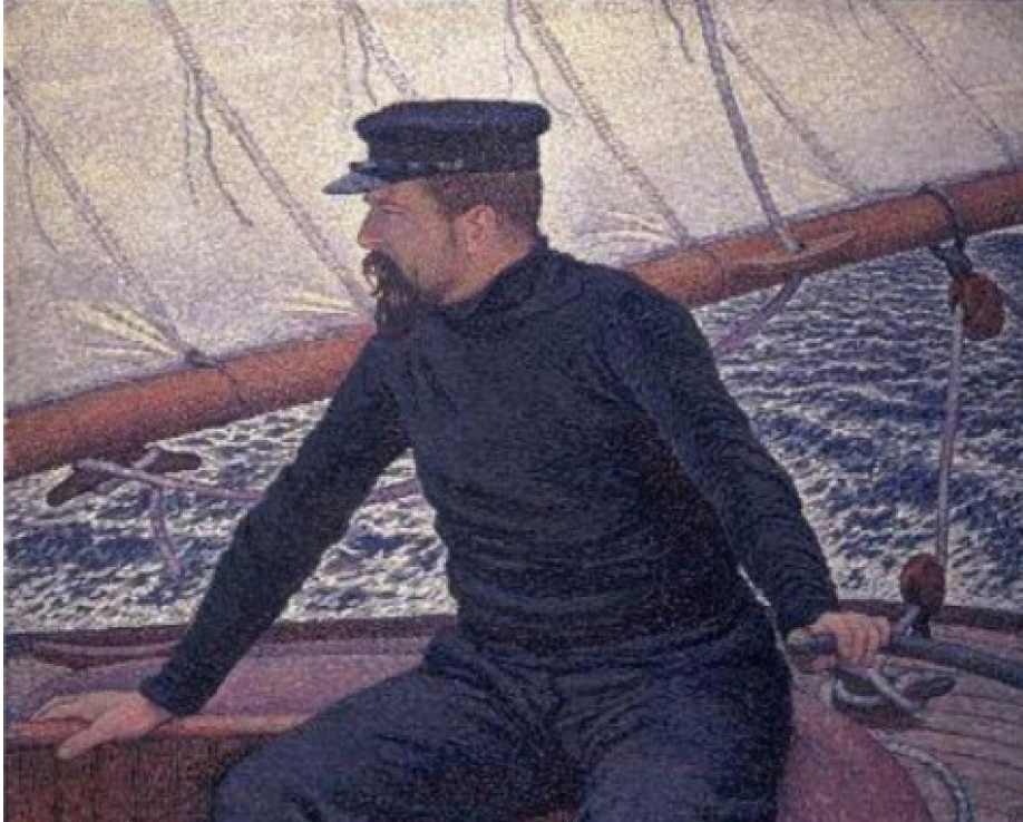 “Ce tableau de Théo Van Rysselberghe résume toute la personnalité de son ami Paul Signac, on y voit la détermination, la force tranquille et tout son caractère est bien défini dans cette toile. Il est en bateau, c’est un marin, il est aussi presque à la tête d’une armée navale. Paul Signac est un marin passionné, formé au canotage par Gustave Caillebotte, il possédera plus de trente bateaux et participera à de nombreuses régates. Ce portrait de Signac est représentatif de leur amitié.” – Charlotte Hellman, arrière-petite-fille du peintre.