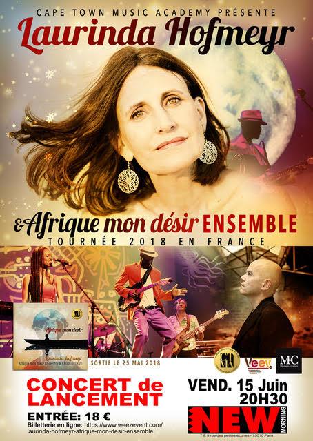 Laurinda Hofmeyr & Afrique mon Désir Ensemble présenteront leur nouvel album « Afrique mon Désir » le vendredi 15 juin à 20h30 sur la scène du New Morning, à l’occasion de sa sortie le 25 mai chez Cape Town Music Academy / In Ouïe Distribution. Ce concert sera également représenté en hommage à l’accordéoniste Régis Gizavo ayant participé à ce projet, et décédé peu de temps après l’enregistrement de l’album.