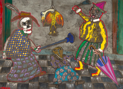 La valse des pantins, toile enterrée, Interprétation de Le bal des pendus de James Ensor, 97x130cm, acrylique et techniques mixtes sur toile de lin, 2018