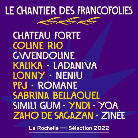 Seul dispositif national dédié entièrement au live, Le Chantier des Francofolies est aujourd’hui reconnu par l’ensemble des acteurs de la filière pour son engagement, sa pertinence et la qualité de son accompagnement. Suzane, Pomme, Christine & The Queens, Hoshi, Bigflo & Oli, Ben Mazué, Thérapie Taxi, Juliette Armanet, Lomepal, Aloïse Sauvage, Hervé, Malik Djoudi, Bonnie Banane, Fils Cara, Martin Luminet, Lucie Antunes… sont quelques marqueurs et autant de belles histoires qui incarnent le Chantier des Francofolies.
