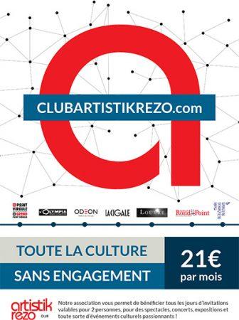 Combien de fois l’argument financier a-t-il freiné vos envies de sorties ? L’adhésion mensuelle au Club Artistik Rezo, c’est l’équivalent d’une place de théâtre ou de concert. Pour 21€ par mois (soit le prix de deux entrées plein tarif au musée), vous pouvez profiter librement de nos invitations cinéma, musique, art et spectacle pour deux personnes.