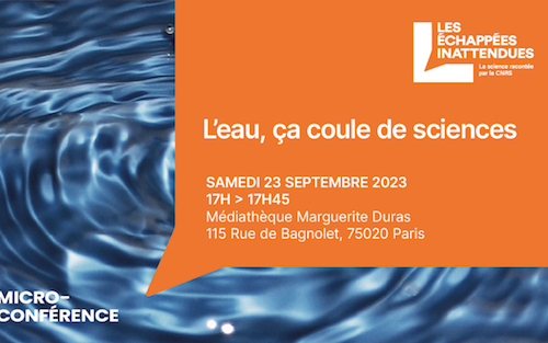Embarquez avec le CNRS pour une Échappée inattendue, le 23 septembre à 17h à la médiathèque Marguerite Duras (Paris XXe). À travers trois micro-conférences de 10 minutes, trois scientifiques apporteront trois éclairages complémentaires sur l’eau.