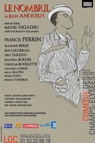 « Dans son style mordant et drôle, dont il est passé maître, Jean Anouilh nous raconte dans sa dernière pièce, Le Nombril, l’histoire d’un auteur à succès, mais se sentant sur une pente descendante, à cause de la menace du nouveau théâtre d’avant-garde. Accablé par une crise de goutte, il se met en tête d’écrire une pièce sur les nombrilistes. Or sa vie, minute après minute, devient un défilé sans fin de nombrilistes acharnés ; que ce soit un ami de toujours, sa famille, sa maitresse, son médecin, ses filles, qui tous viennent réclamer ce dont ils estiment mordicus avoir droit.