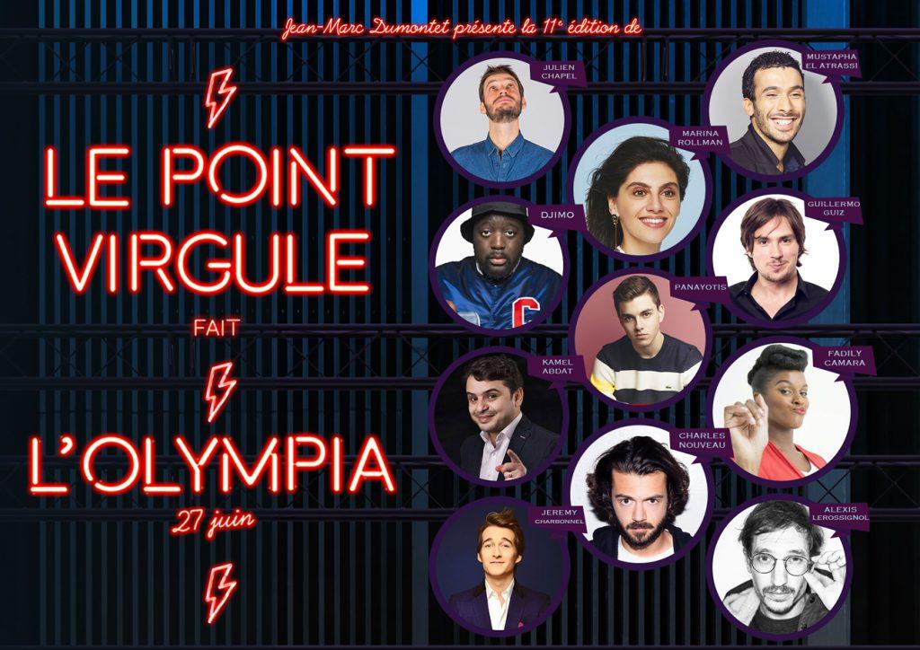 Le 28 avril 2008, le Point Virgule fêtait ses 30 ans sur la scène de l’Olympia. Fort du succès rencontré, le Point Virgule fait l’Olympia est devenu depuis onze ans, un rendez-vous annuel. Pour cette 11ème édition, 50 ans après mai 68, nous avons choisi de mettre à l’honneur la liberté d’expression. Nous nous devons de la fêter… Notre objectif est modeste mais on ne peut plus important : rire ! On ne va pas jeter des pavés, juste revenir aux fondamentaux : des artistes, une scène, la liberté de parole et vous.