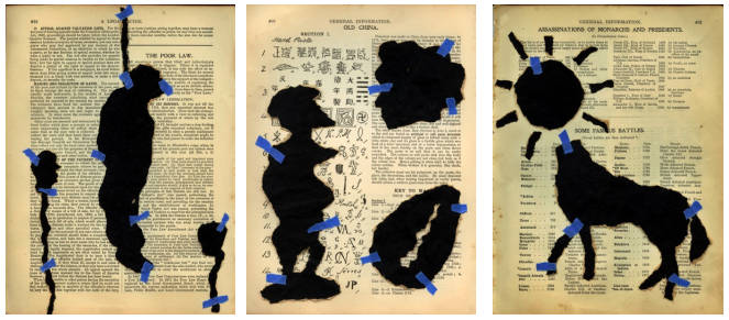 Du tumulte du monde au silence du papier, 2021, acrylique sur craft, scotch de masquage bleu et page d’encyclopédie de 1906 sous l’Empire colonial britannique