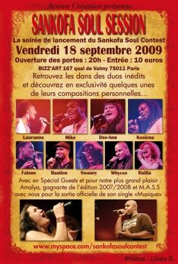 Retrouvons-nous pour la « Sankofa Soul Contest », la traditionnelle soirée de lancement de la saison. Pour cette 4ème édition du “Sankofa Soul Contest”, vous y retrouverez dans des duos inédits : Lauranne (la grande gagnante de la saison 2008/2009), Mike, Swaany, Dee-Ann, Kesiena, Dalila, Bastien, Falone et Whycee. Vous aurez le plaisir de découvrir en exclusivité quelques-unes de leurs compositions !