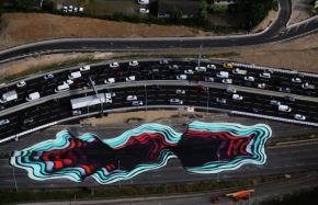 En effet, réalisée en moins d’une semaine c’est 4500 m2 de bitume qui ont été recouverts par 400 litres de peinture donnant l’illusion sur le périphérique d’un immense cratère aux couleurs futuristes s’ouvrant sur la circulation. L’artiste allemand est connu pour ses illusions optiques laissant apparaître des ouvertures très colorées en 3D sur les murs gris et bétonnés des grandes villes.