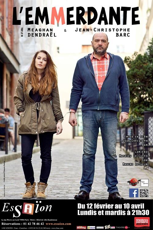 Mais « L’emmerdante » est d’abord une pièce sociale traitant de multiples sujets, qui sont débattus par les deux personnages, sans jamais dicter de conduite à suivre. De l’Allemagne nazie à la disparition du zébu de Madagascar, en passant par Robespierre et la peine de mort, les avis et les convictions fusent pour laisser le spectateur sur sa propre raison. Les thèmes abordés comme l’homosexualité ou le handicap sont des sujets qui nous touchent particulièrement par leur inconcevable injustice actuelle. Pourtant aucune leçon ne veut être donnée. Il s’agit de confronter deux intelligences, deux natures, deux dérisions et deux manières de réagir face aux problèmes auxquels chaque humain doit faire face aujourd’hui. Deux personnalités fortes s’opposent : Mathilde est l’Emmerdante… C’est une battante, anarchiste, moderne, plutôt politiquement incorrecte qui défend ses idées extrêmes avec pertinence, force et humour face à Louis, un quinquagénaire fraîchement divorcé, dont les opinions deviennent de plus en plus pessimistes avec l’âge et ses expériences de la vie. Malgré leurs idéologies divergentes, la garde à vue va se transformer en conversation, qui va amener ces deux natures à se confier plus qu’ils ne l’avaient prévu… jusqu’à s’apprécier sincèrement lorsqu’ils découvrent leur admiration commune pour Brassens. Il pourrait être son père, elle a l’âge d’être sa fille et cette relation paternelle et bienveillante nous rappelle que même si le monde va mal, l’amour partagé, sous n’importe quelle forme, mérite finalement notre présence sur Terre.
