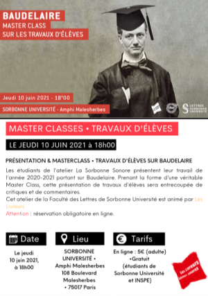 Les étudiants de l’atelier “La Sorbonne Sonore” présentent leur travail de l’année 2020-2021 portant sur Baudelaire. Prenant la forme d’une véritable Master Class, cette présentation de travaux d’élèves sera entrecoupée de critiques et de commentaires.