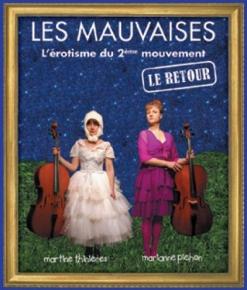 Les deux comédiennes des MAUVAISES (Martine Thinières et Marianne Pichon) osent le faux, le raté, le pas beau, munies de leurs violoncelles, dont elles s’emparent sans complexe. Avec une sagesse de fausses idiotes, elles parodient l’érudition musicale, se gargarisent de mots et de postures (nos deux “mauvaises” ont la langue aussi bien pendue que leur archet est tordu et tordant) et se hasardent sur des voies musicales pour le moins…….. expérimentales ! Avec un humour fou, elles démontrent que chacun a droit à sa petite part de bonheur, sans être nécessairement “bon”, que la vraie virtuosité n’est peut-être pas toujours là où on l’attend, que le ratage est souvent synonyme de poésie…