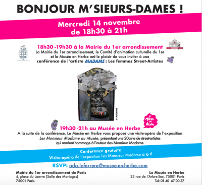 De 18h30 -19h30 à la Mairie du 1er arrondissement ; La Mairie du 1er arrondissement, le Comité d’animation culturelle du 1er et le Musée en Herbe ont le plaisir de vous inviter à une conférence de l’artiste MADAME : Les femmes Street-Artistes.