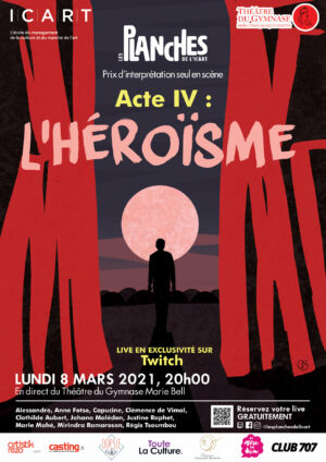 Les Planches de l’ICART vous présentent l’Acte IV. Le 8 Mars, 10 artistes sélectionnés se produiront au théâtre du Gymnase Marie Bell à Paris et partageront avec vous leur vision de l’Héroïsme. Au rendez-vous, plusieurs disciplines s’entremêleront : du théâtre, de la danse, du slam et du stand up!