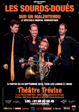 Autour d’un ensemble à vent jusqu’ici jamais pensé ni entendu associant clarinette, trompette, cor et clarinette basse aux sonorités riches et détonantes, c’est entre humour échevelé et émotion intense, et avec une technique irréprochable, que Les SourdsDoués se sont inventé un genre rigoureux comme le classique, débridé comme le music-hall. Dans une mise en scène inventive, sensible et enlevée, les complices s’affirment comme un quatuor musical atypique, aussi déjanté que virtuose explorant avec humour et délectation leurs univers musicaux favoris pour amener petits et grands à ouvrir les oreilles et à décoincer les zygomatiques ! Fruit d’un travail collectif, ce spectacle musical humoristique conçu pour toute la famille est indéniablement un incontournable…